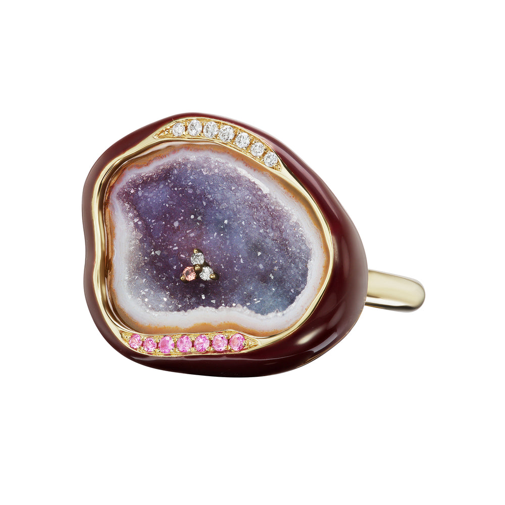 This modern cocktail ring features a light lavender crystal, striking Plum enamel, orbited by diamonds and rubies and pierced with colored sapphires. Inspired by the natural qualities of Geodes wearing this ring will enhance spiritual well-being and connect you to the Earth's energy as well as make a statement.