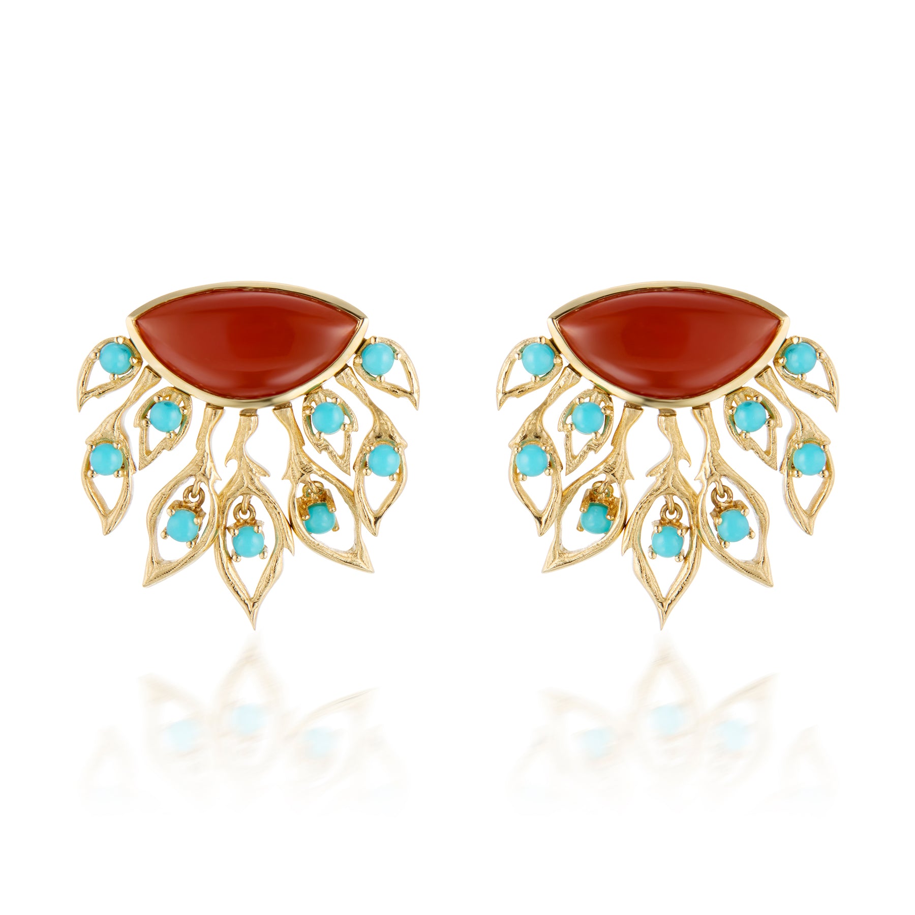The Vow of Love Earrings are sculptural and expressive, built around a bold Carnelian cabochon that glows with warmth and depth. From its curved silhouette, gold peacock-feather forms radiate outward, each tipped with a vibrant Turquoise cabochon. The feathers move gently as you do, creating a soft flutter of color and light.