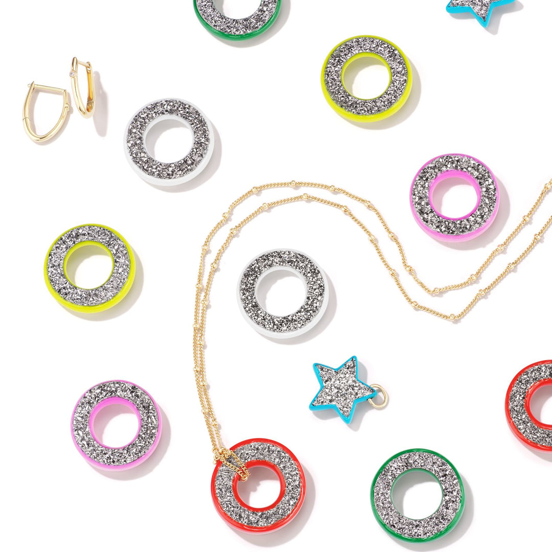The Charmed collection's Star and Orbit charms are made of natural stone, Druzy. The druzy crystals are platinum plated and the stone's back is enameled. Use the special jewelry cleaning cloth (a gift from us with every purchase) to clean your piece. Avoid dropping your charms on hard surfaces. Enamel can chip or change color when subjected to extreme temperatures or abrasive detergents. To clean your gold huggies, soak them (without the charms) in a bowl with lukewarm water and a few drops of non-detergent soap for around 10 minutes to remove any oil and loosen any dirt buildup. Rinse with water, then wipe gently with your jewelry cleaning cloth.